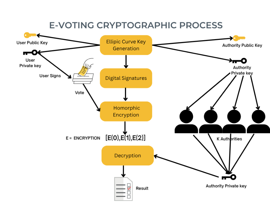 Figure 2. E-voting cryptographic process illustrating key generation, digital signatures, homomorphic encryption, and threshold decryption by multiple authorities to produce verifiable results (created by Israel Oni).