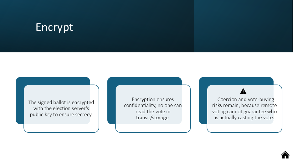 Coercion and Vote Buying | Without supervised polling places, voters at home may be pressured or bribed. If receipts reveal votes, it becomes easy to sell votes. | Design receipt-free systems and coercion-resistant protocols, such as Benaloh challenges or re-voting mechanisms that allow a coerced vote to be overridden later [21]. | Studies show remote voting environments make voters vulnerable to subtle family or workplace coercion [24]. |