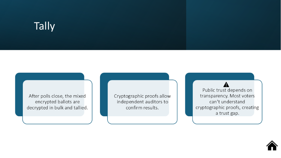 Trust and Public Confidence | Even if cryptographically secure, systems must be perceived as fair and transparent. Public mistrust can invalidate an otherwise working system. | Use open-source software, third-party audits, and voter-verifiable protocols to build confidence. | Switzerland suspended its e-voting program in 2019 after researchers revealed vulnerabilities, undermining trust [25]. |